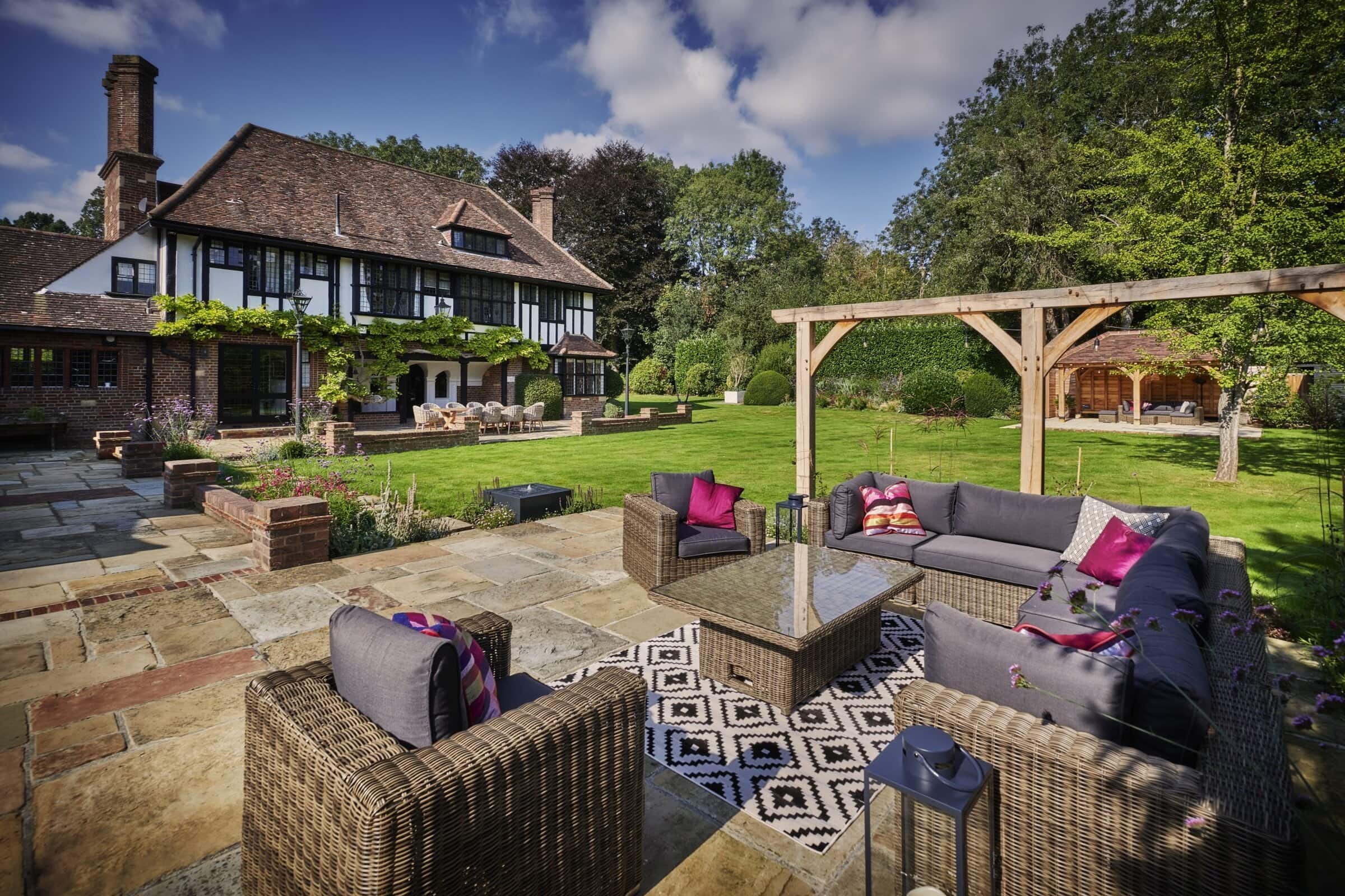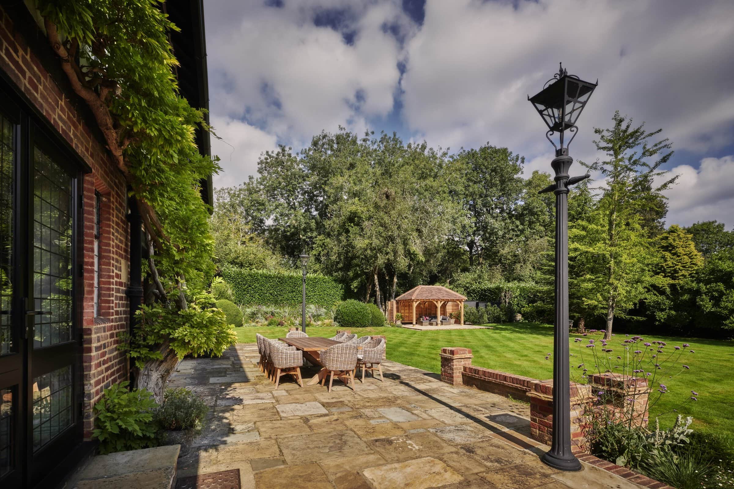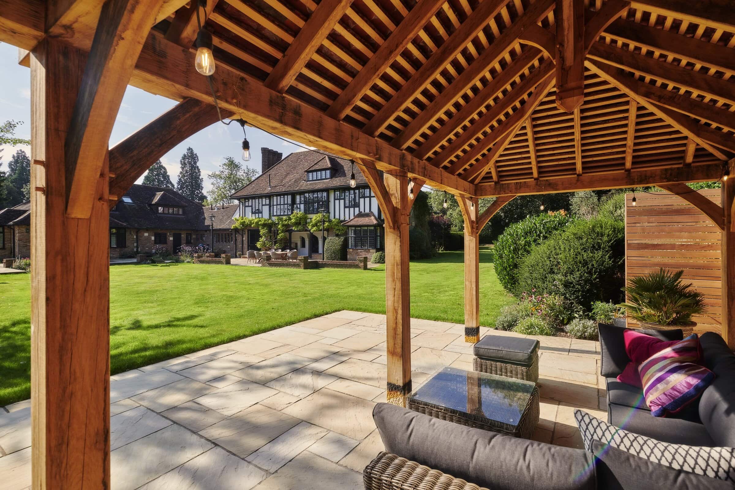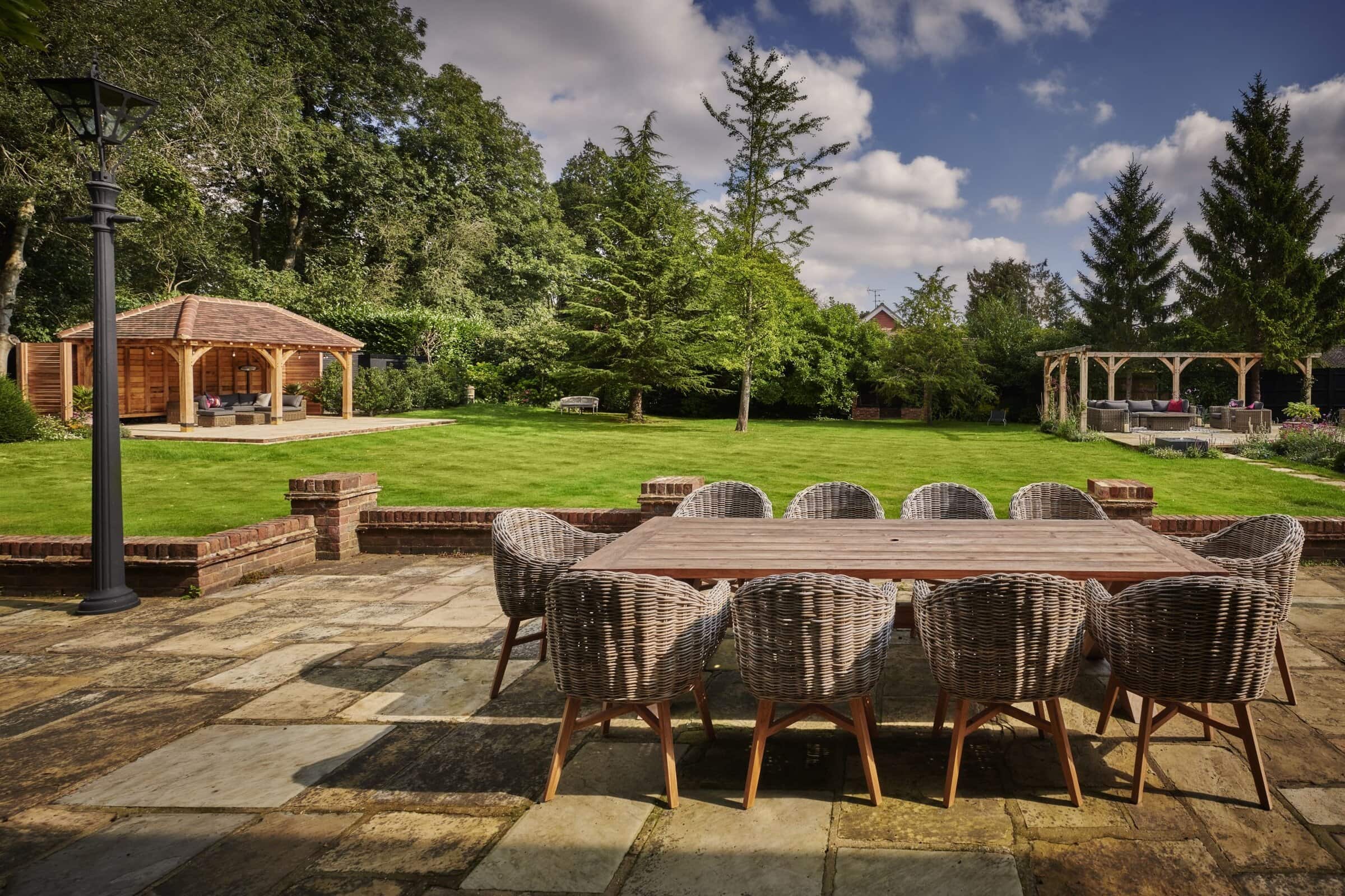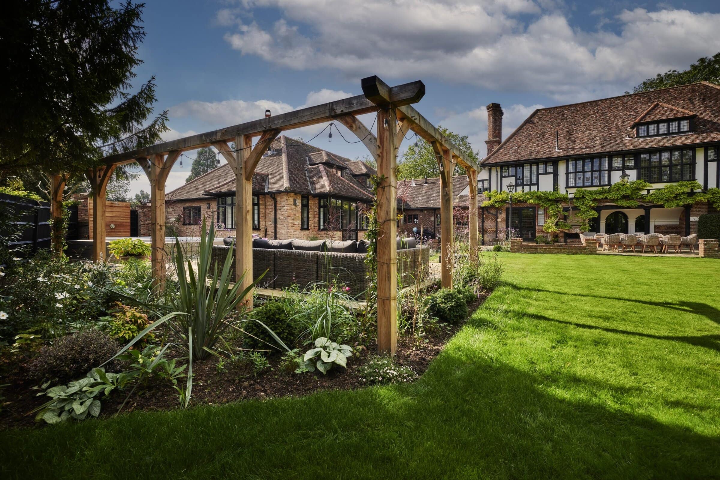 Presiding over the dining area is a handcrafted oak pergola, a striking feature that offers dappled shade and a defined space for alfresco dining or quiet moments of retreat. The solid oak beams evoke a sense of permanence and tradition, adding architectural depth and rustic charm to this countryside haven.