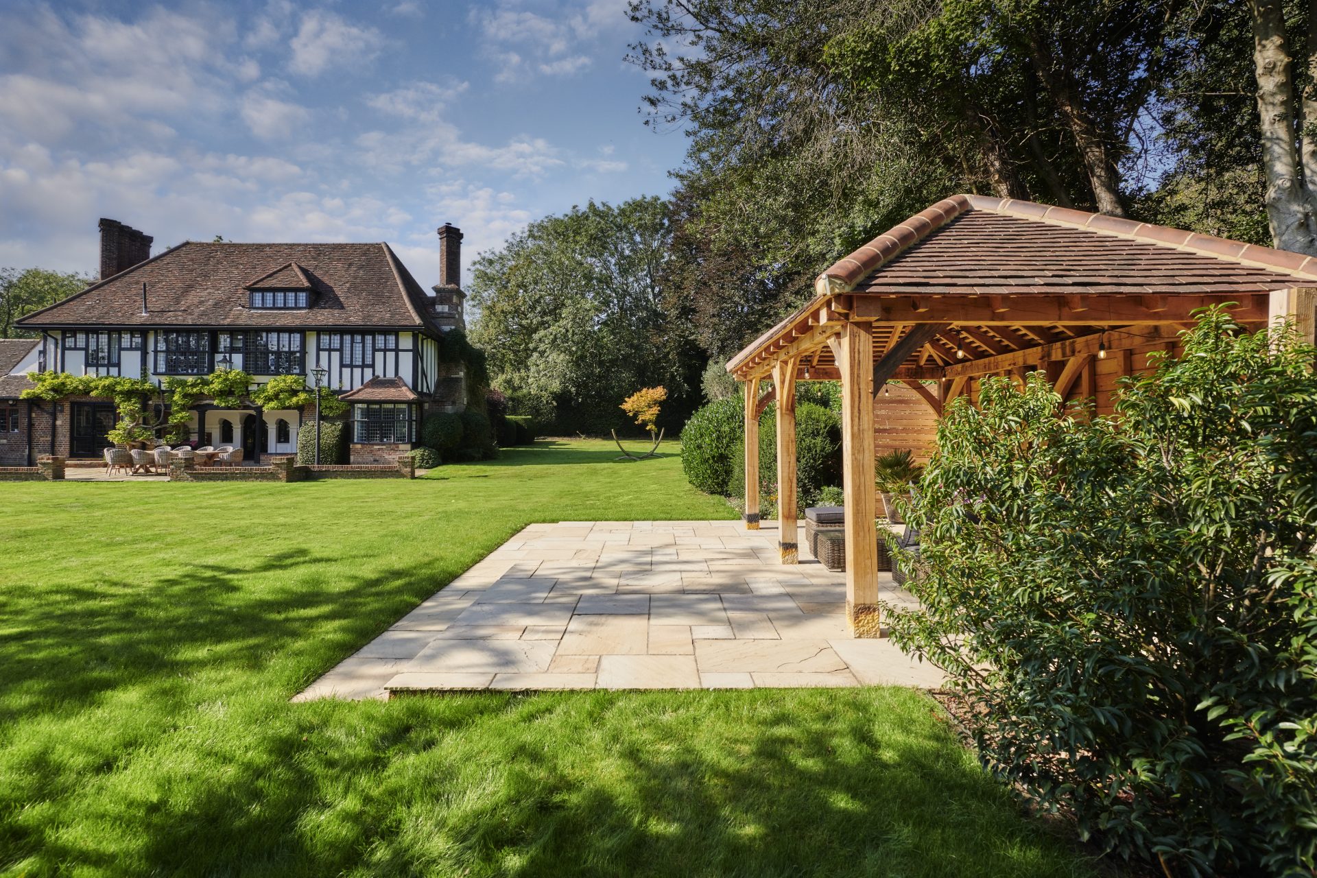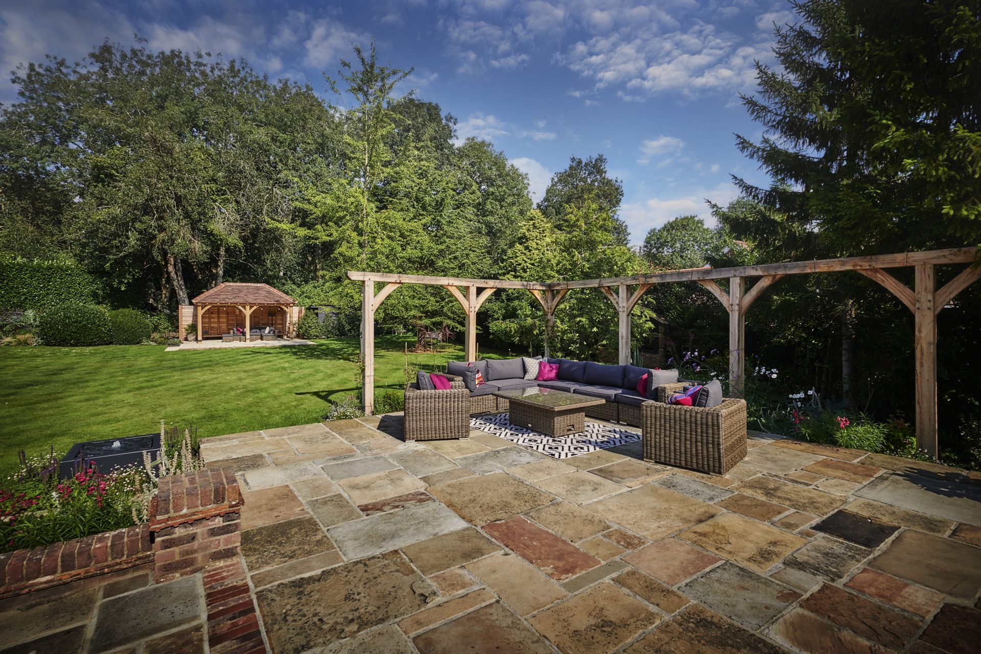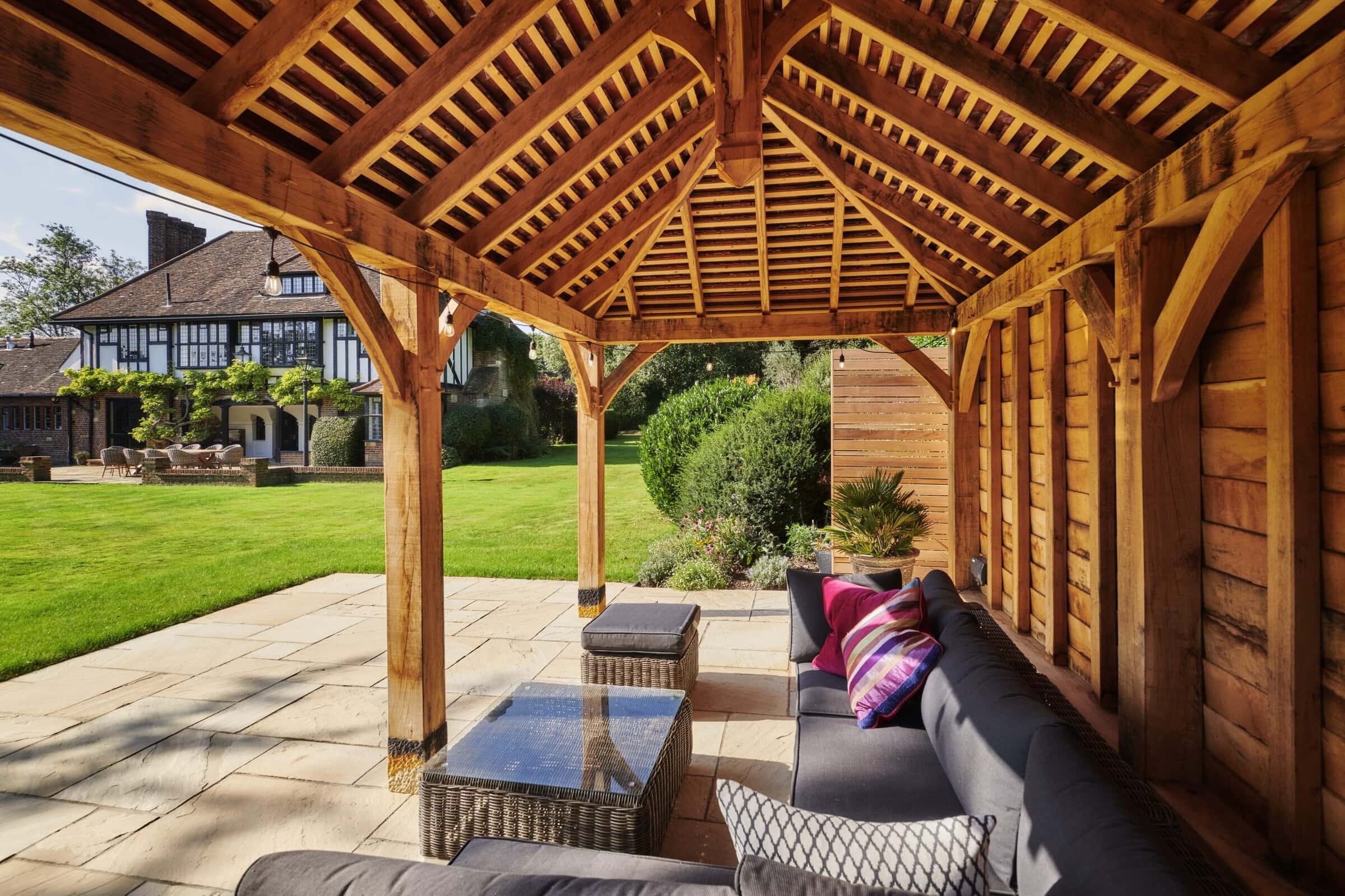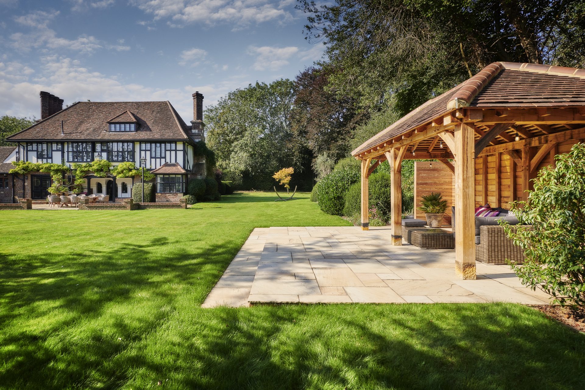 Presiding over the dining area is a handcrafted oak pergola, a striking feature that offers dappled shade and a defined space for alfresco dining or quiet moments of retreat. The solid oak beams evoke a sense of permanence and tradition, adding architectural depth and rustic charm to this countryside haven.