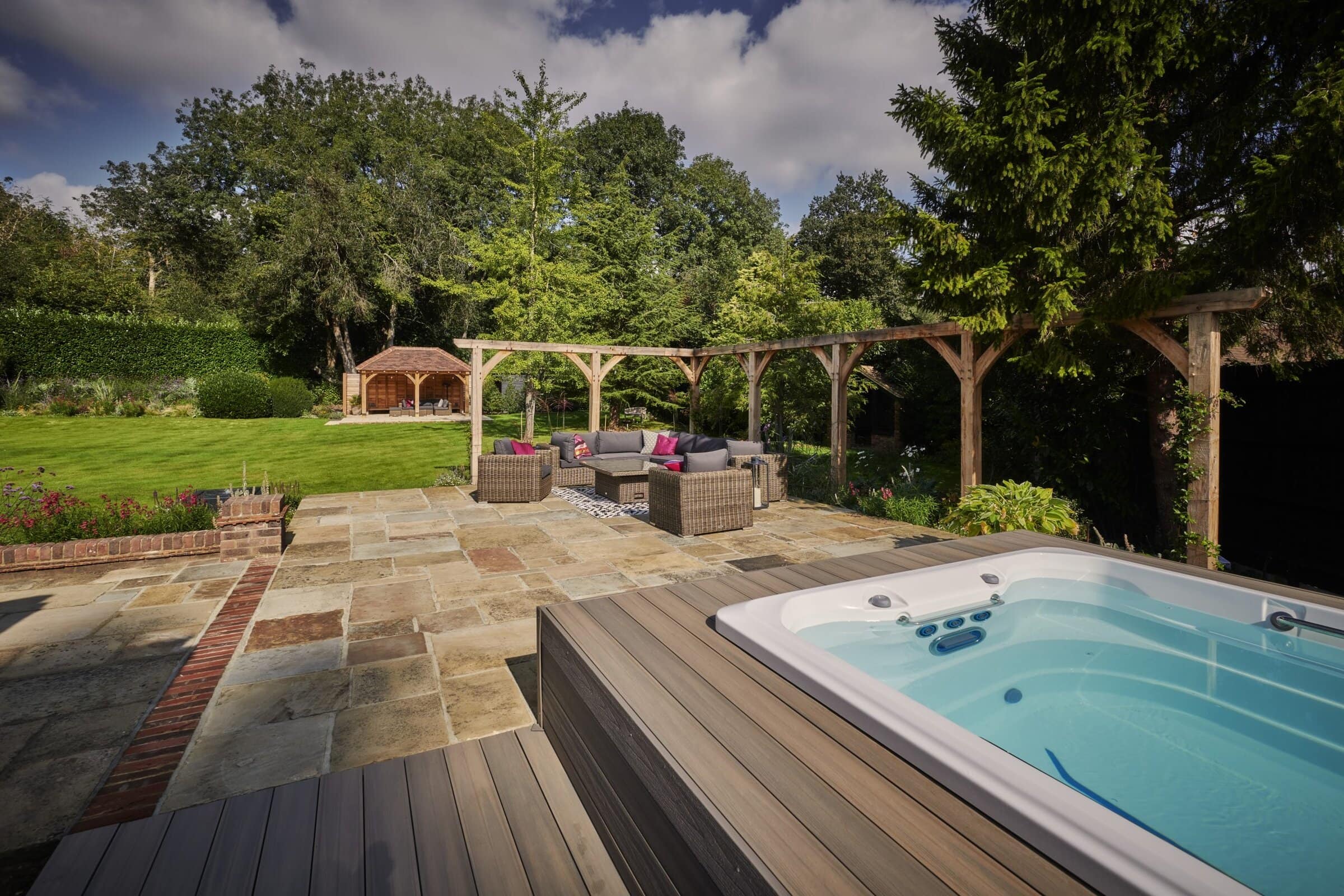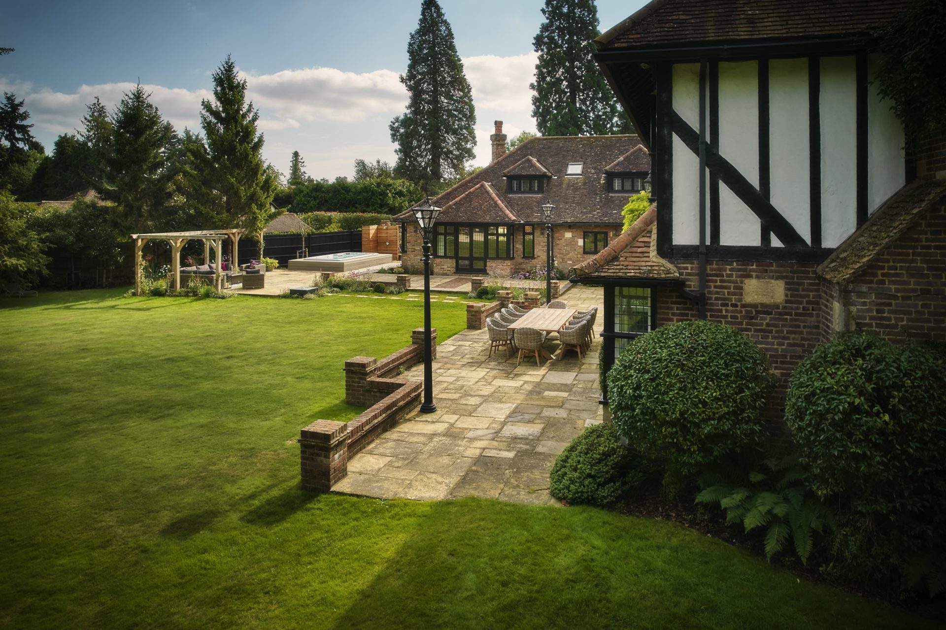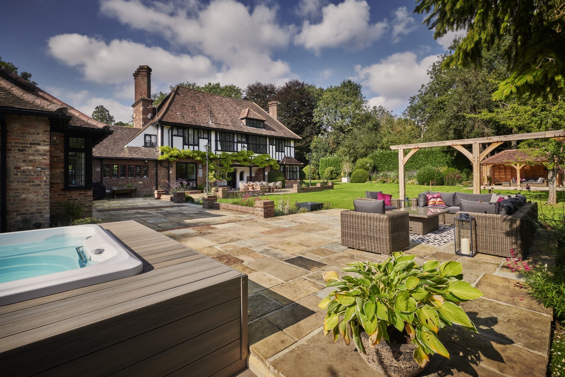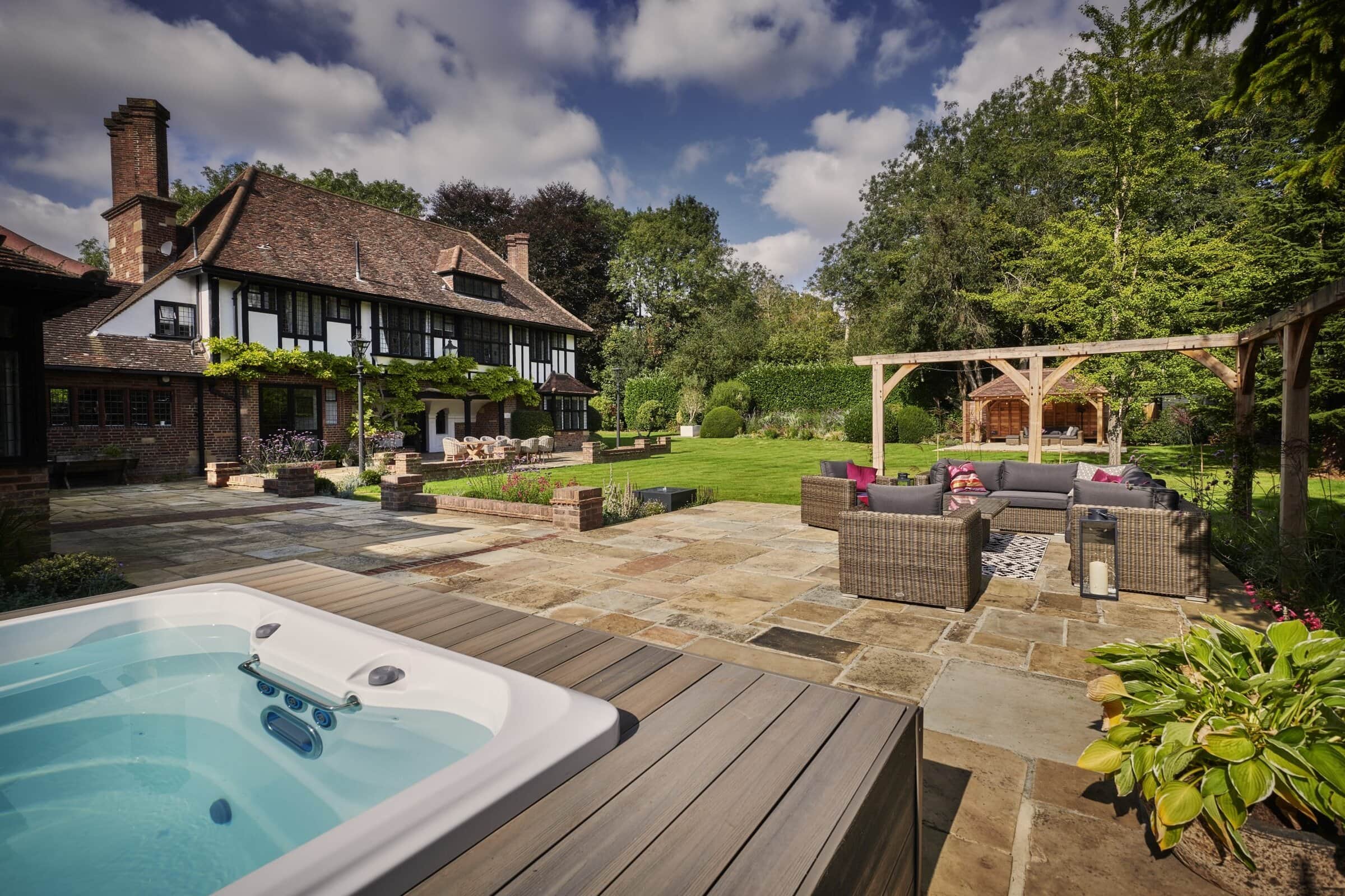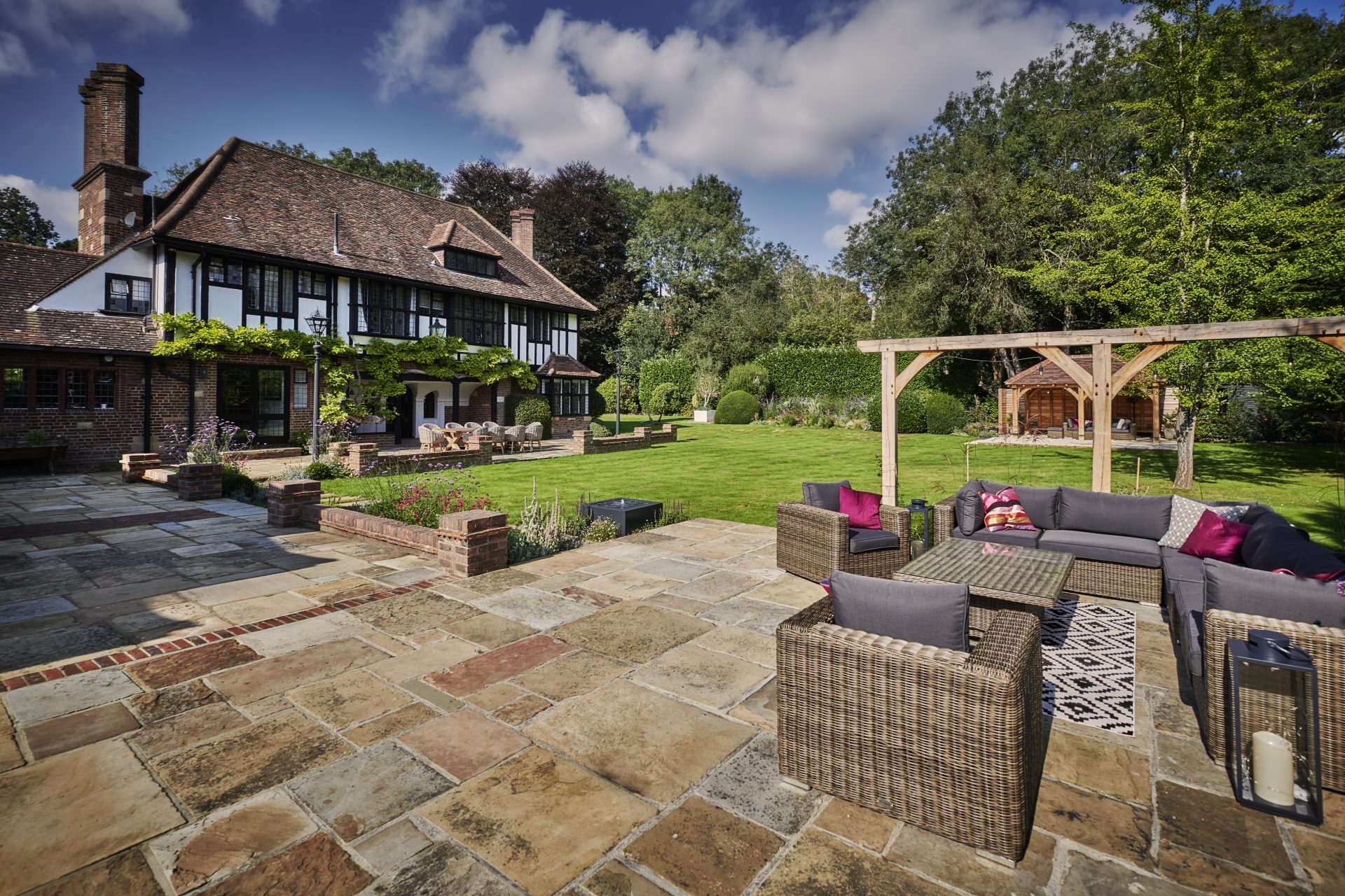 Presiding over the dining area is a handcrafted oak pergola, a striking feature that offers dappled shade and a defined space for alfresco dining or quiet moments of retreat. The solid oak beams evoke a sense of permanence and tradition, adding architectural depth and rustic charm to this countryside haven.