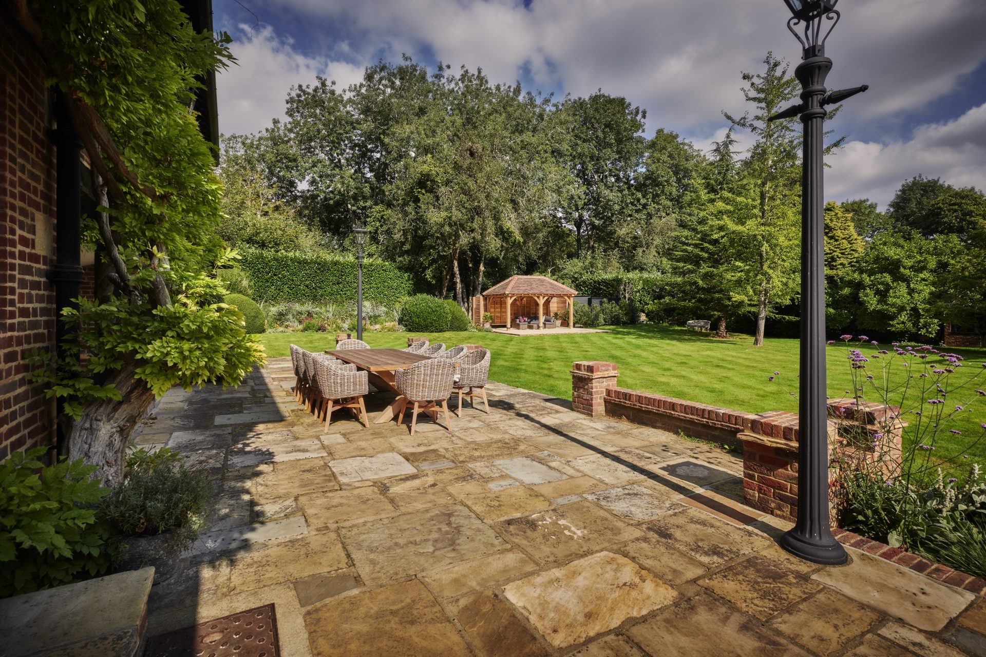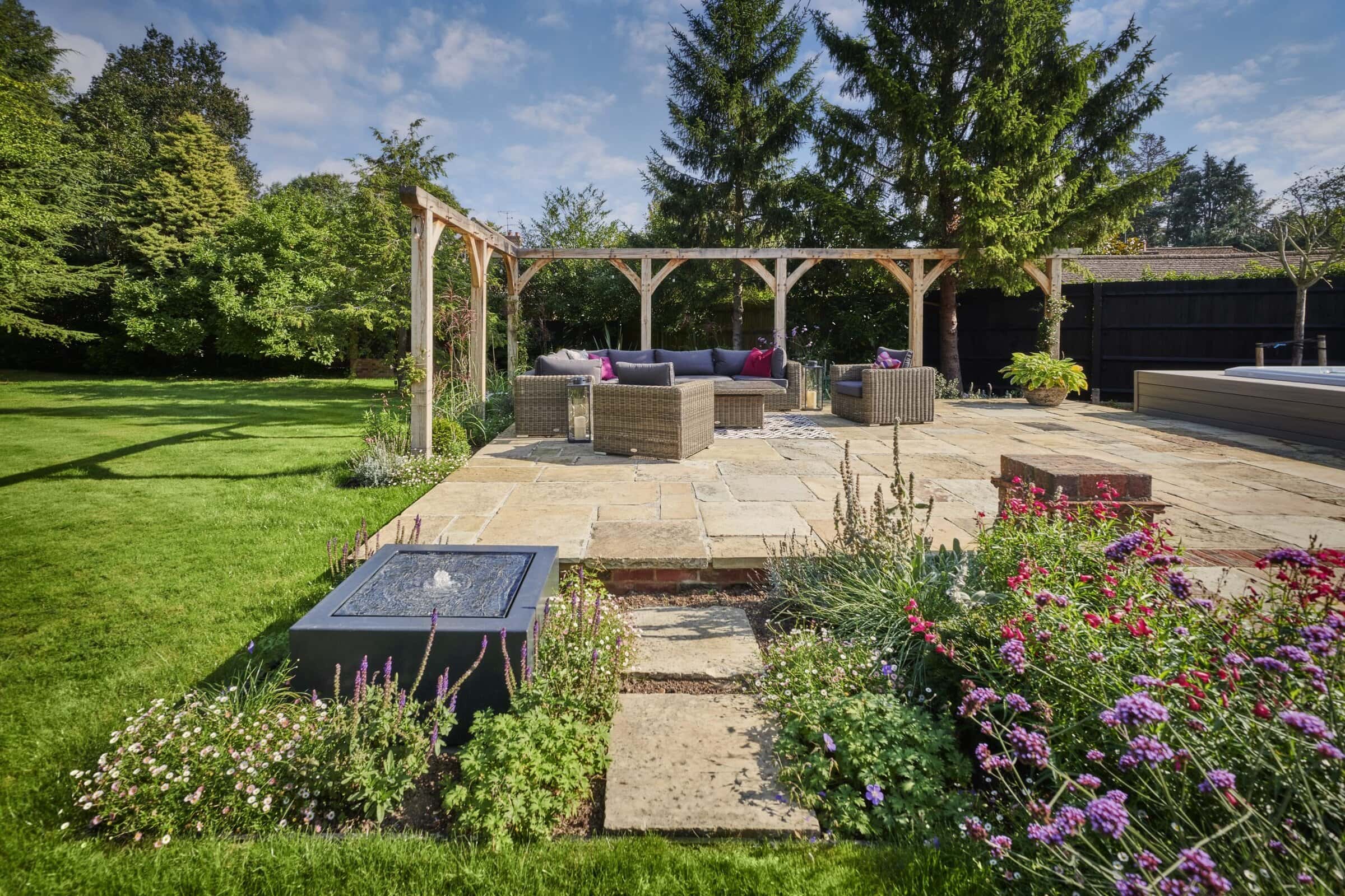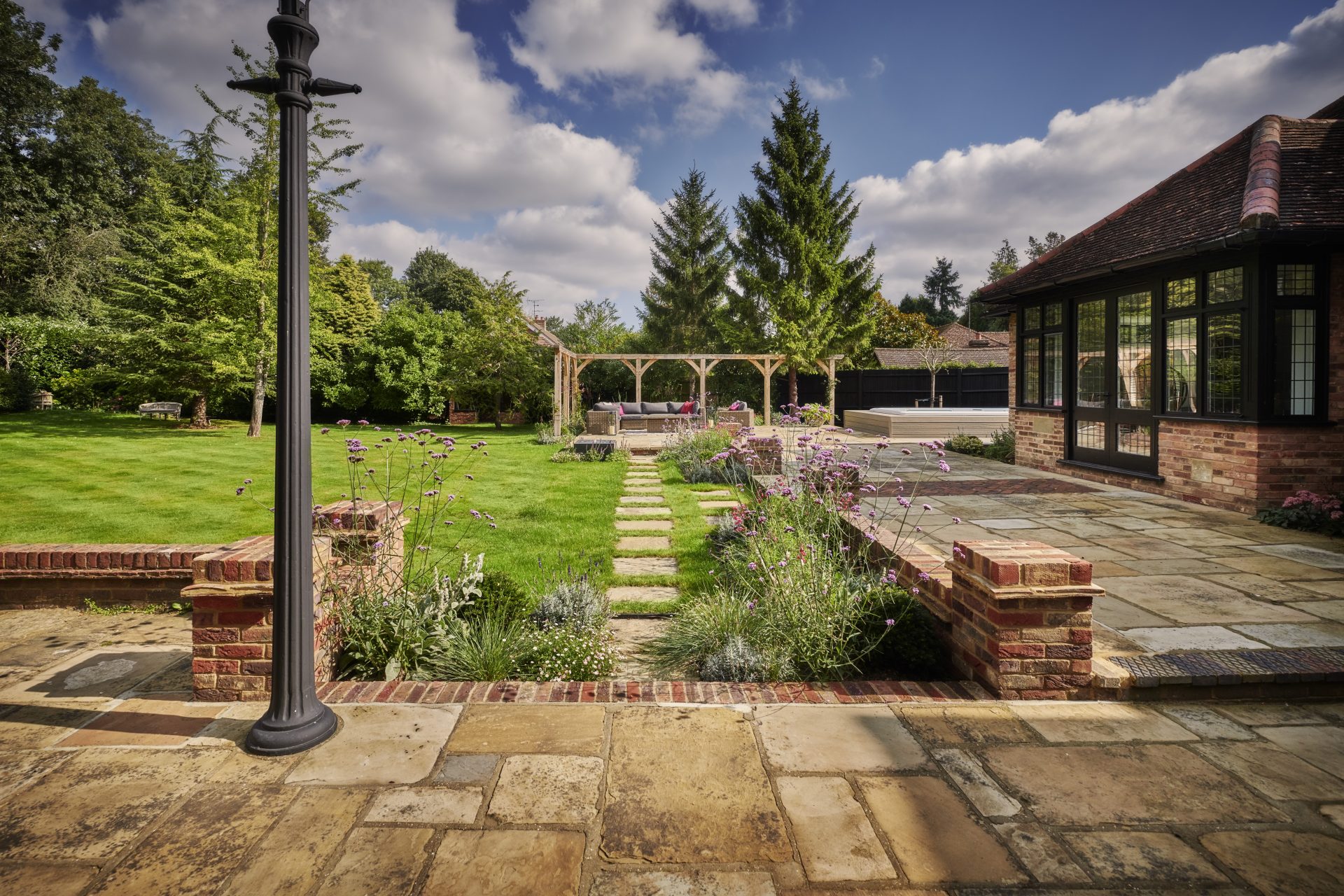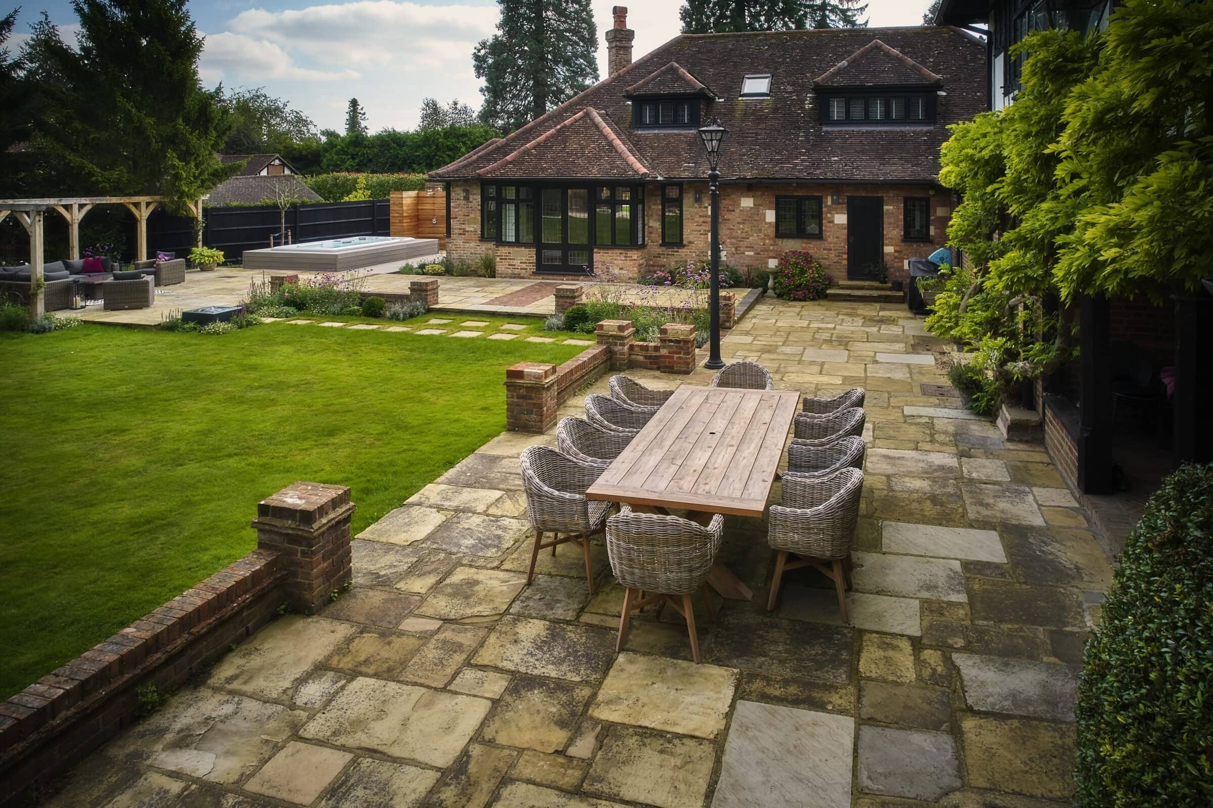 Natural Yorkstone paving forms the foundation of the garden’s paths and patios, a timeless choice that complements the property’s traditional character. Its rich, varied tones and textured surface bring warmth and authenticity, grounding the space with a sense of heritage and understated elegance.