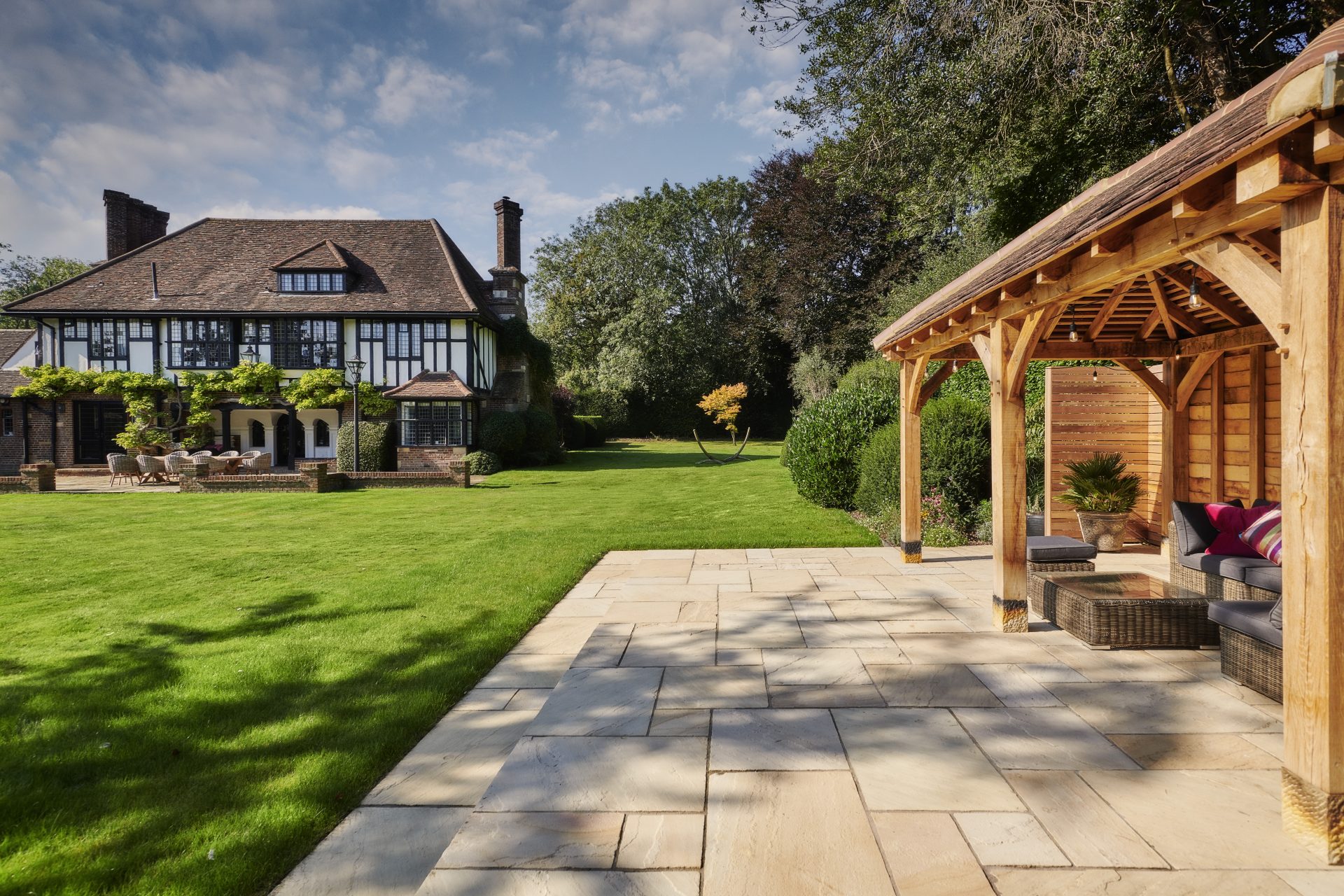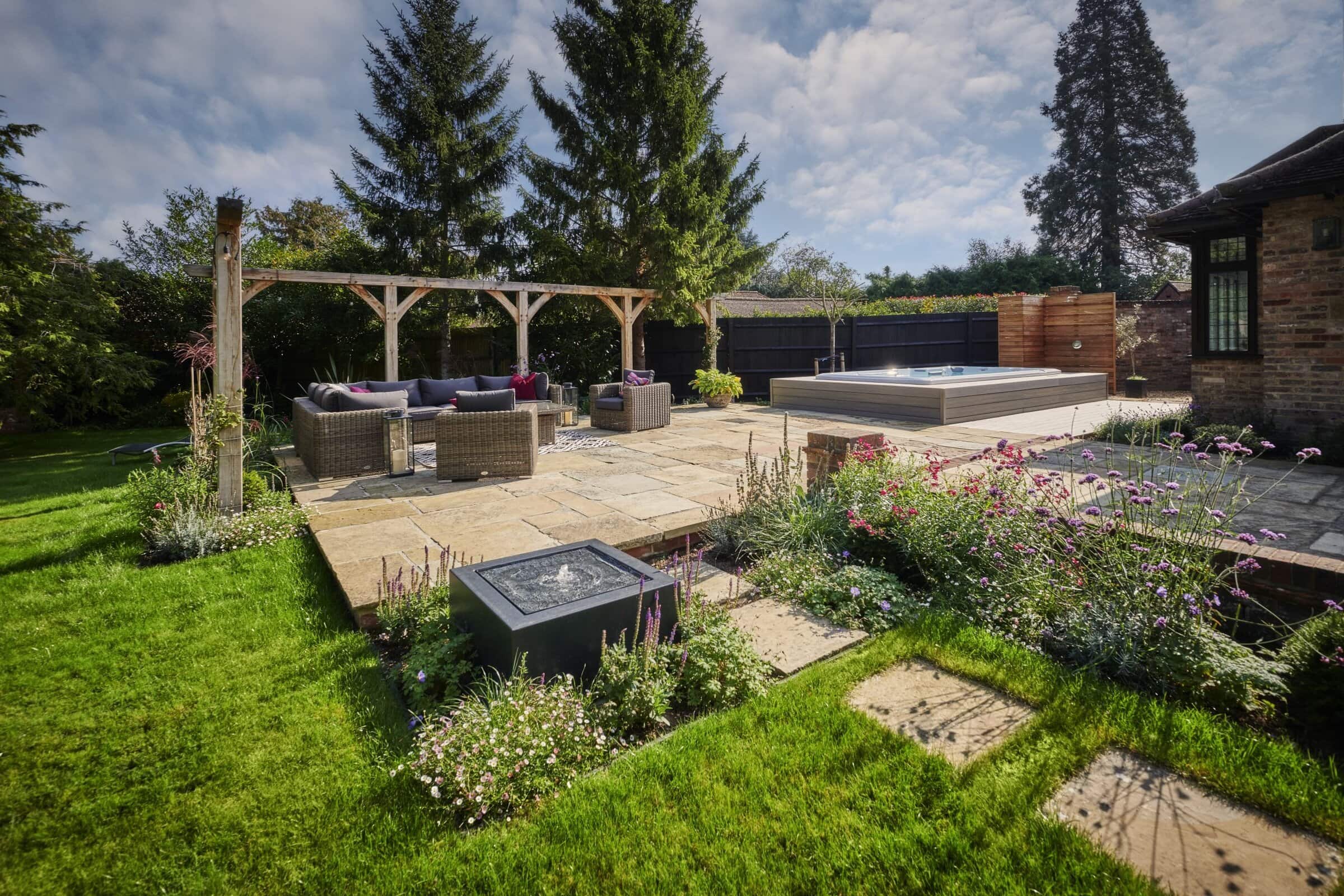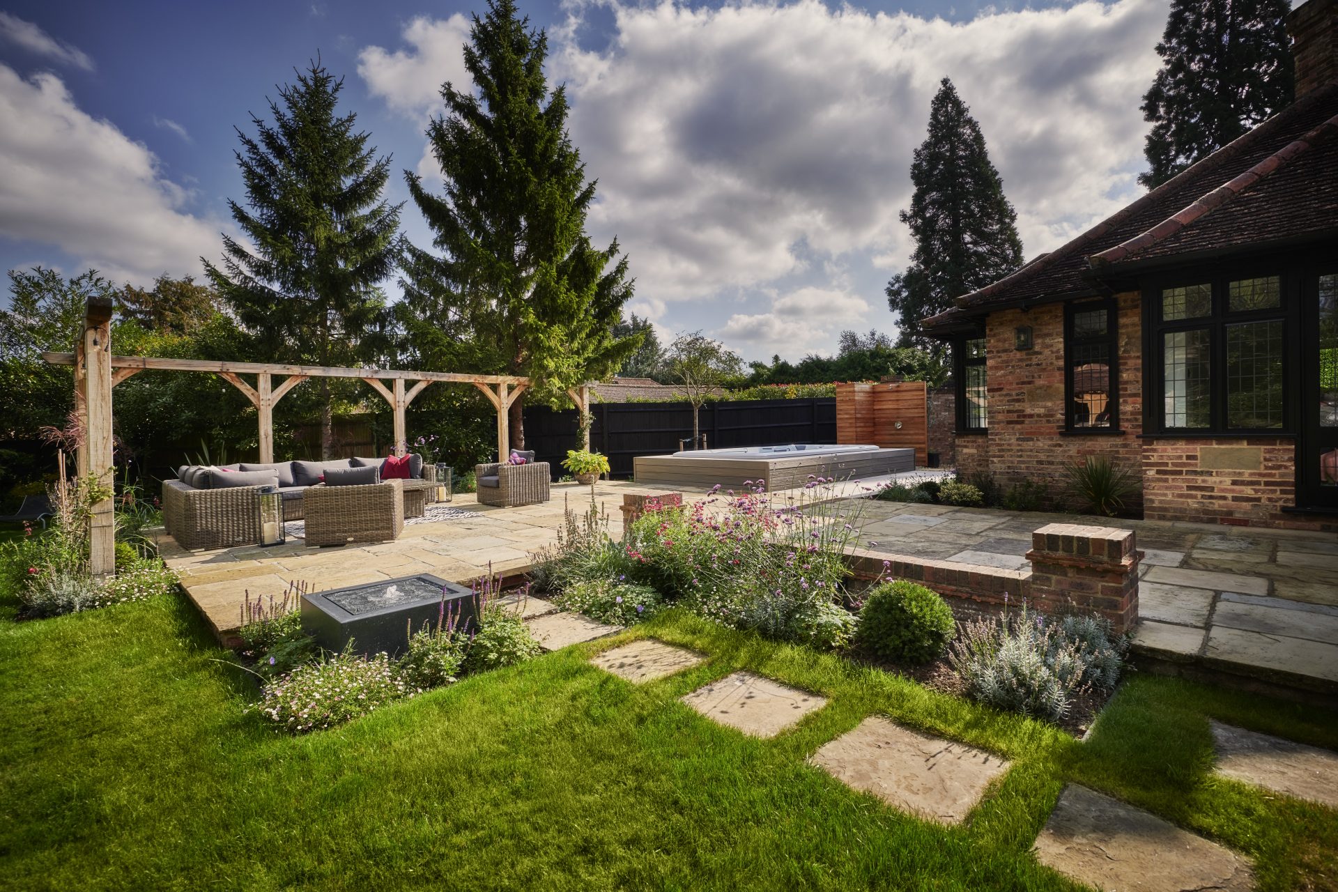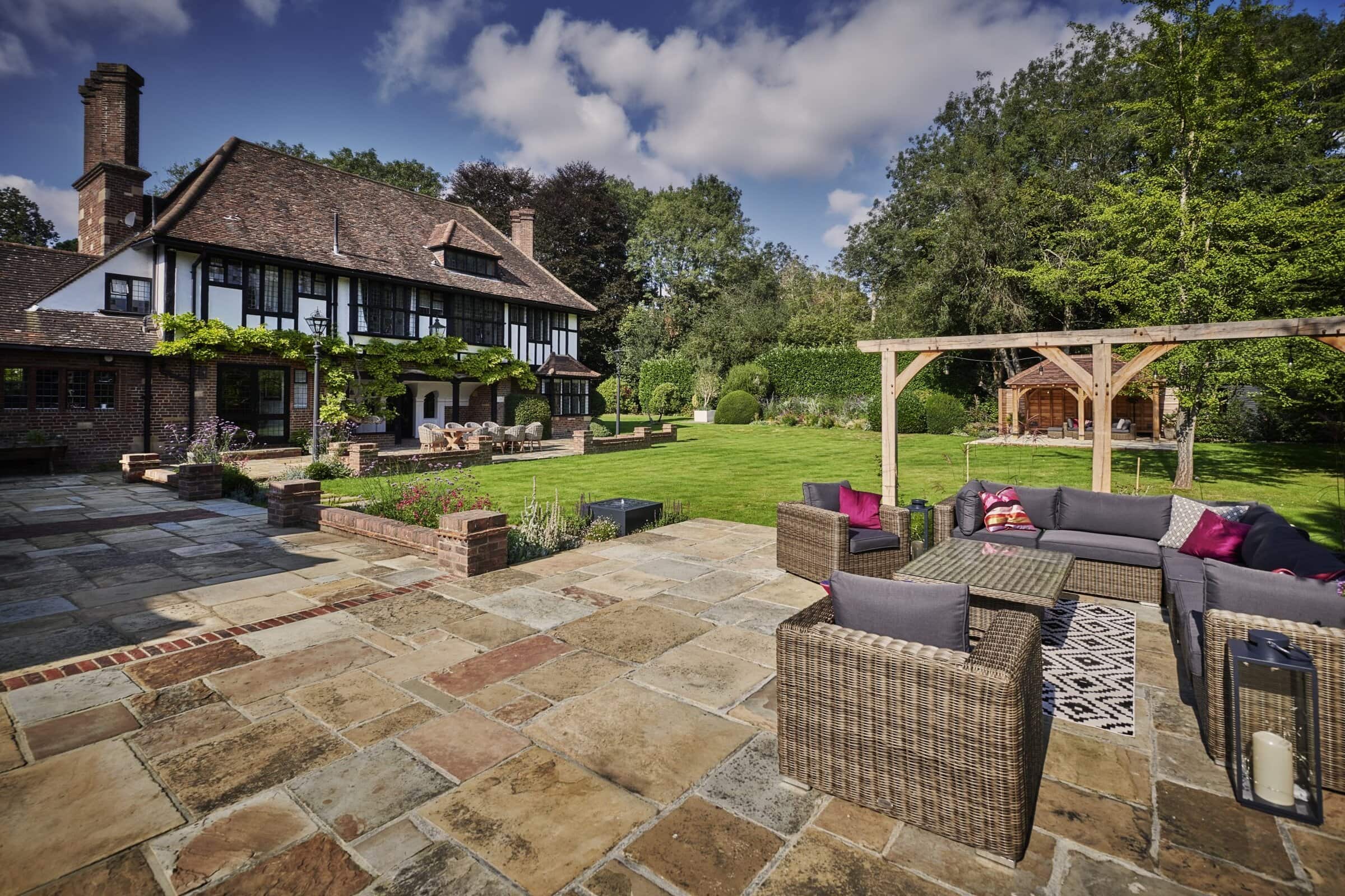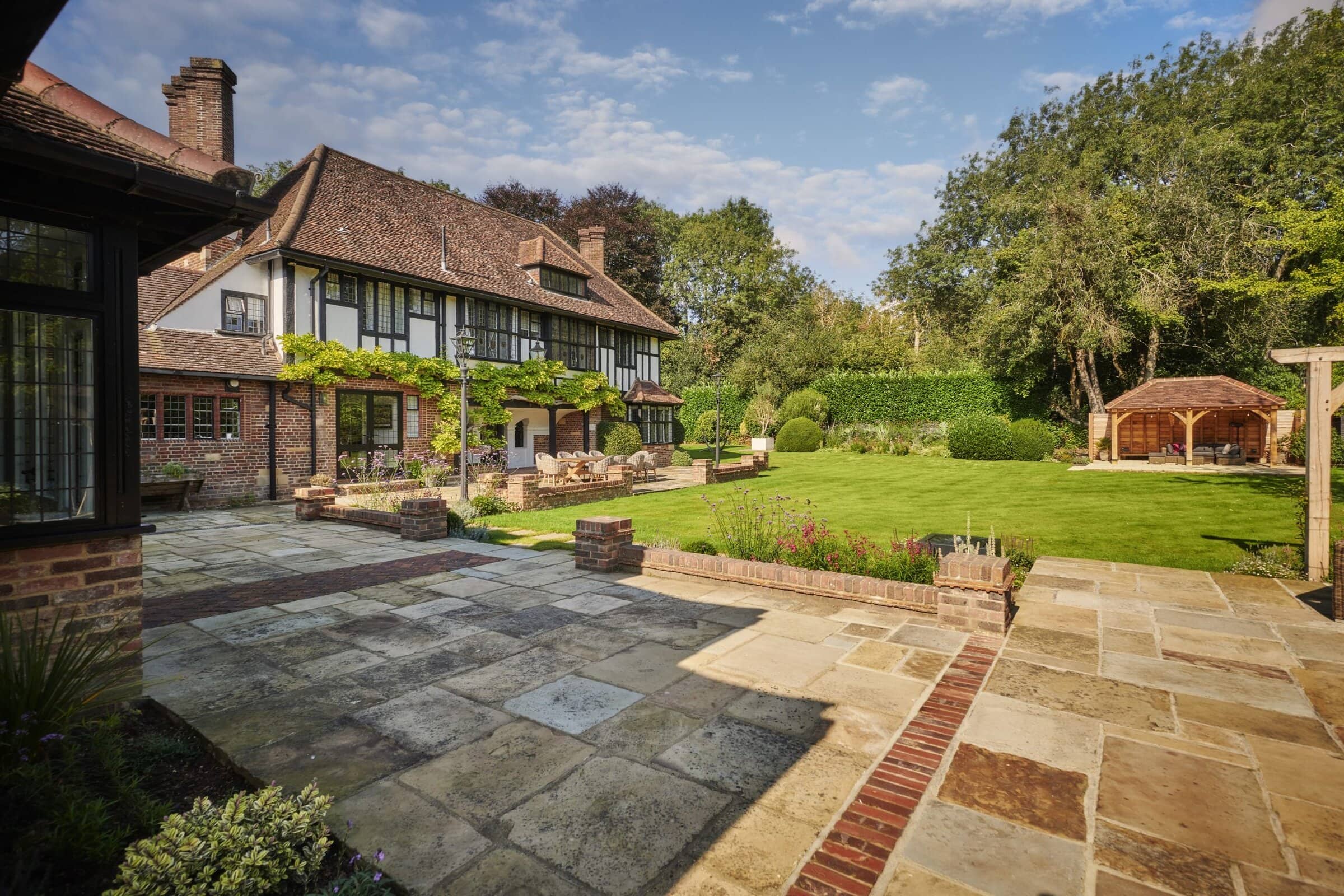Natural Yorkstone paving forms the foundation of the garden’s paths and patios, a timeless choice that complements the property’s traditional character. Its rich, varied tones and textured surface bring warmth and authenticity, grounding the space with a sense of heritage and understated elegance.