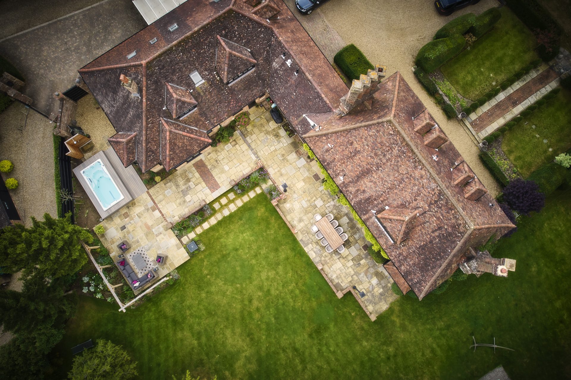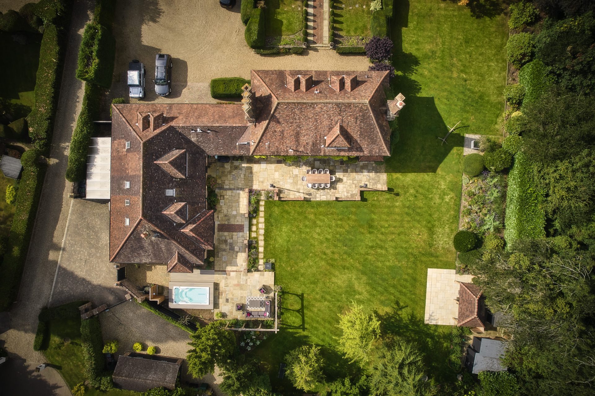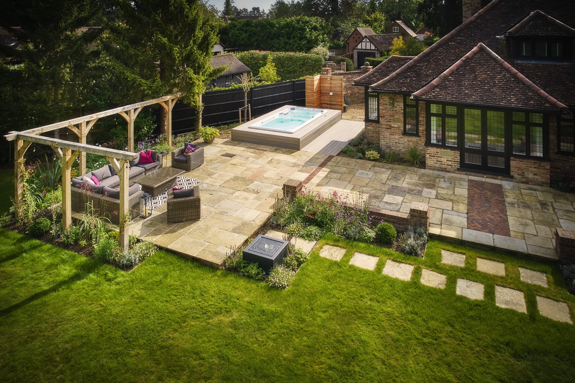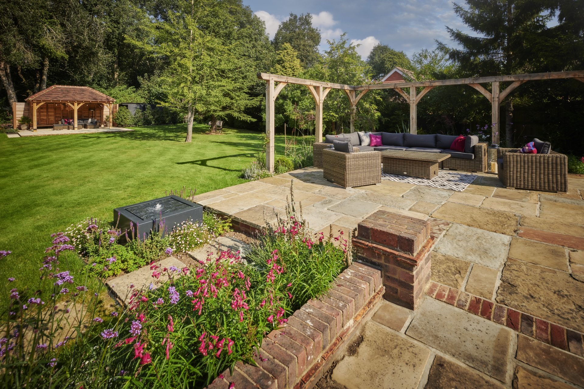 Natural Yorkstone paving forms the foundation of the garden’s paths and patios, a timeless choice that complements the property’s traditional character. Its rich, varied tones and textured surface bring warmth and authenticity, grounding the space with a sense of heritage and understated elegance.