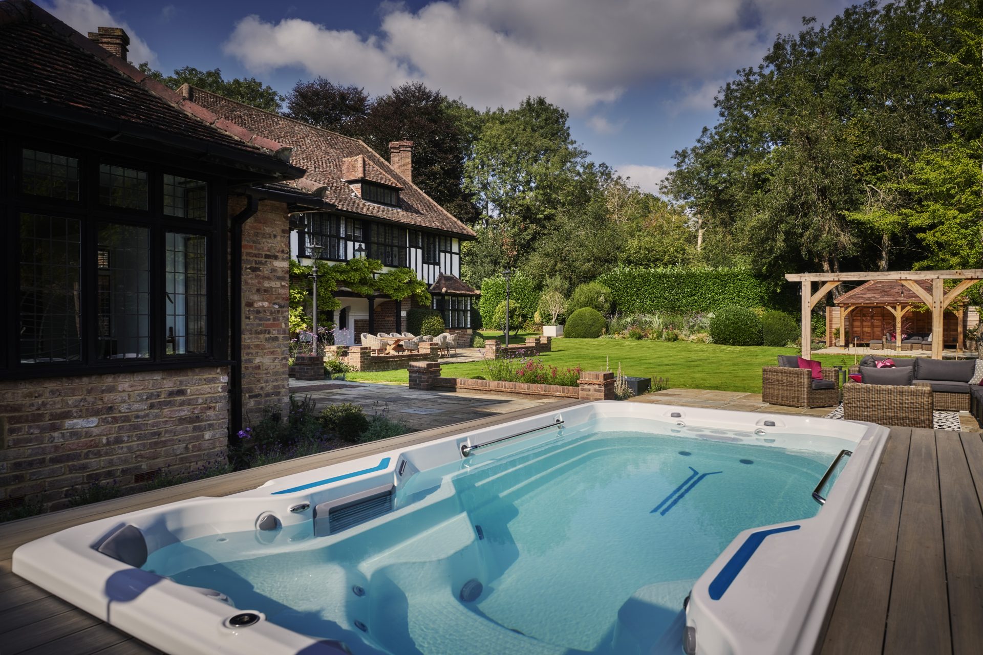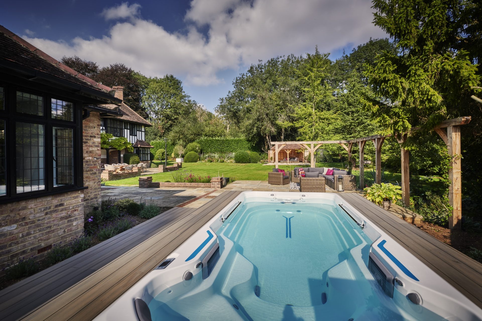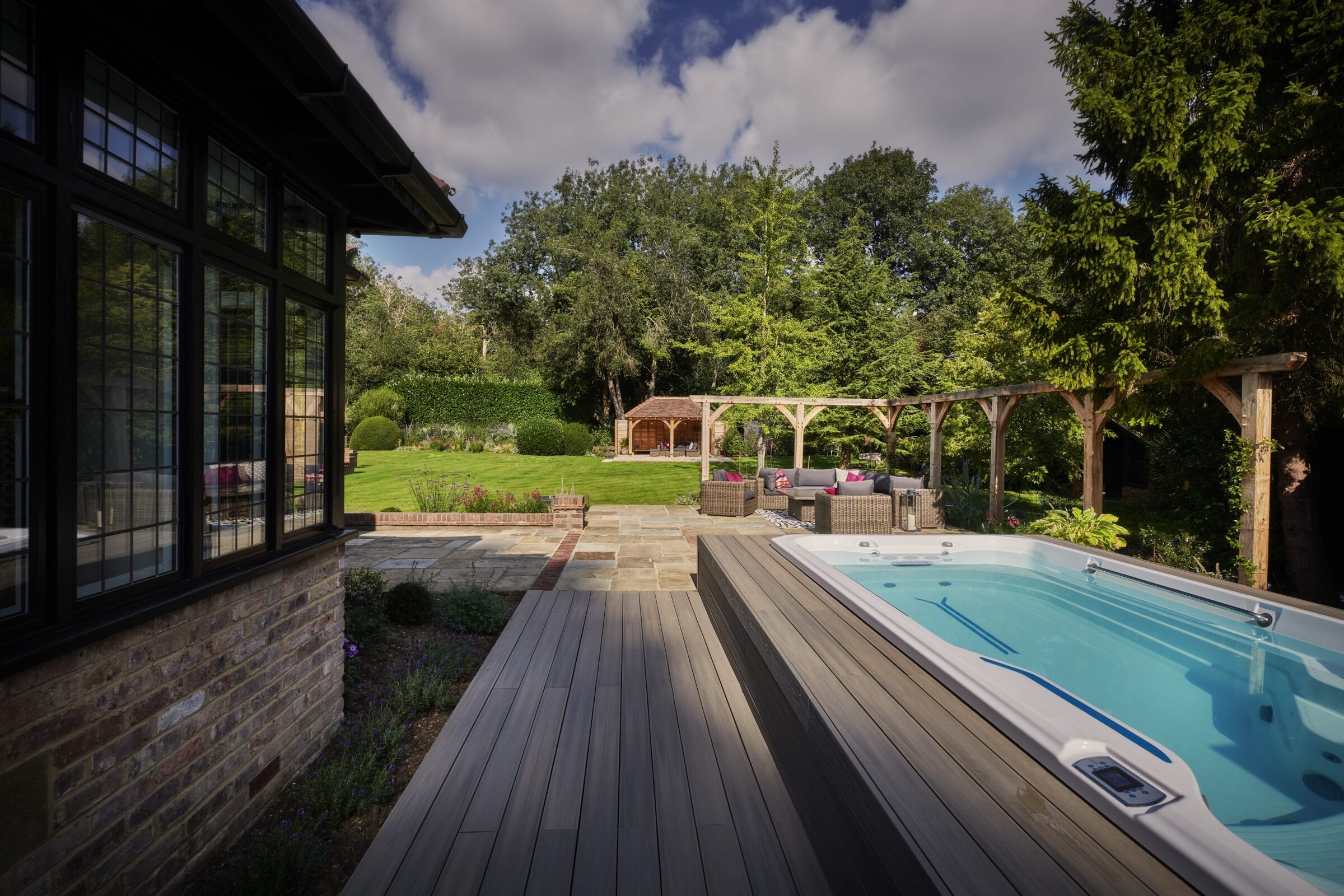 At the heart of this retreat lies a partially sunken swim spa, effortlessly woven into the landscape. Positioned for privacy yet open to tranquil views, it offers the perfect balance of seclusion and connection to nature. Nearby, a cedar-clad outdoor shower introduces a rustic touch of luxury and an invitation to unwind under the open sky in true countryside style.