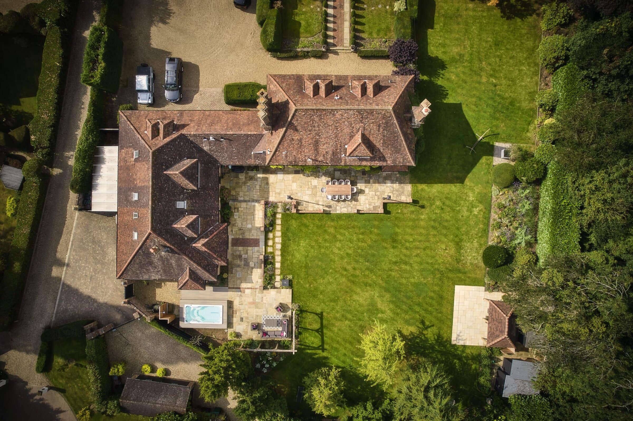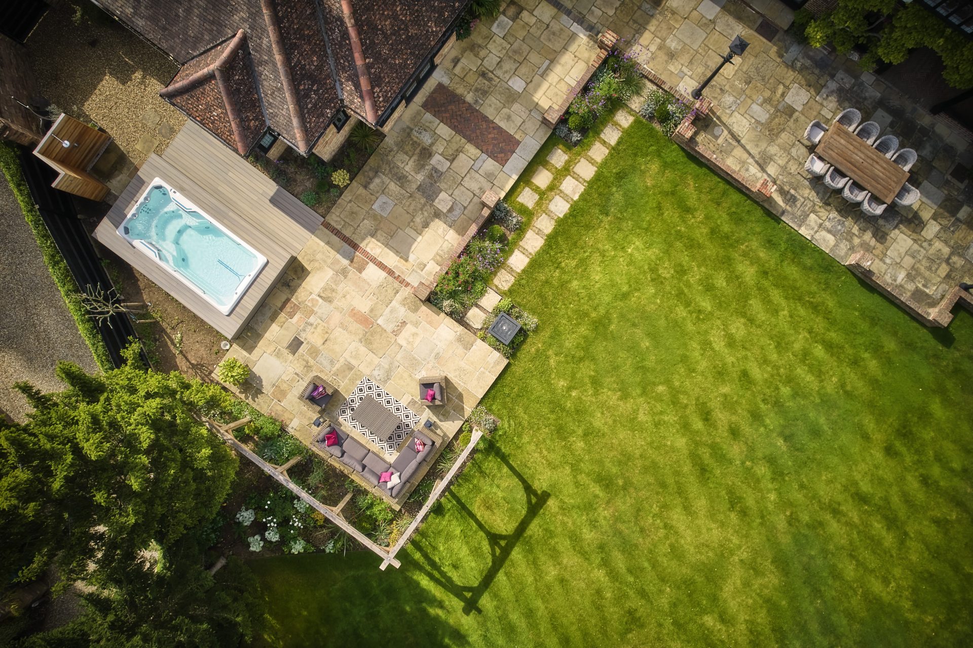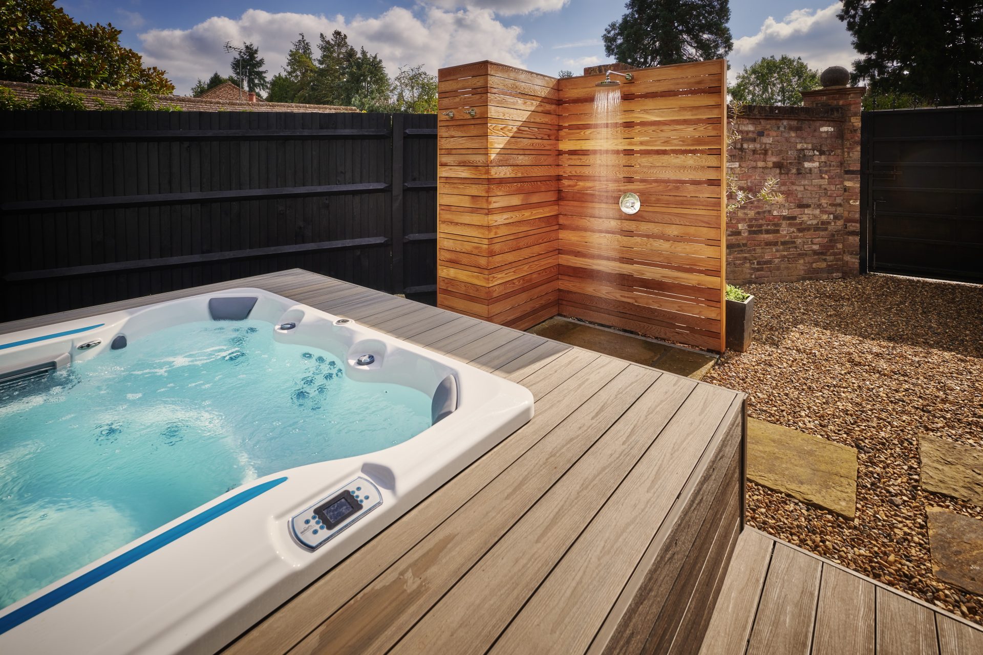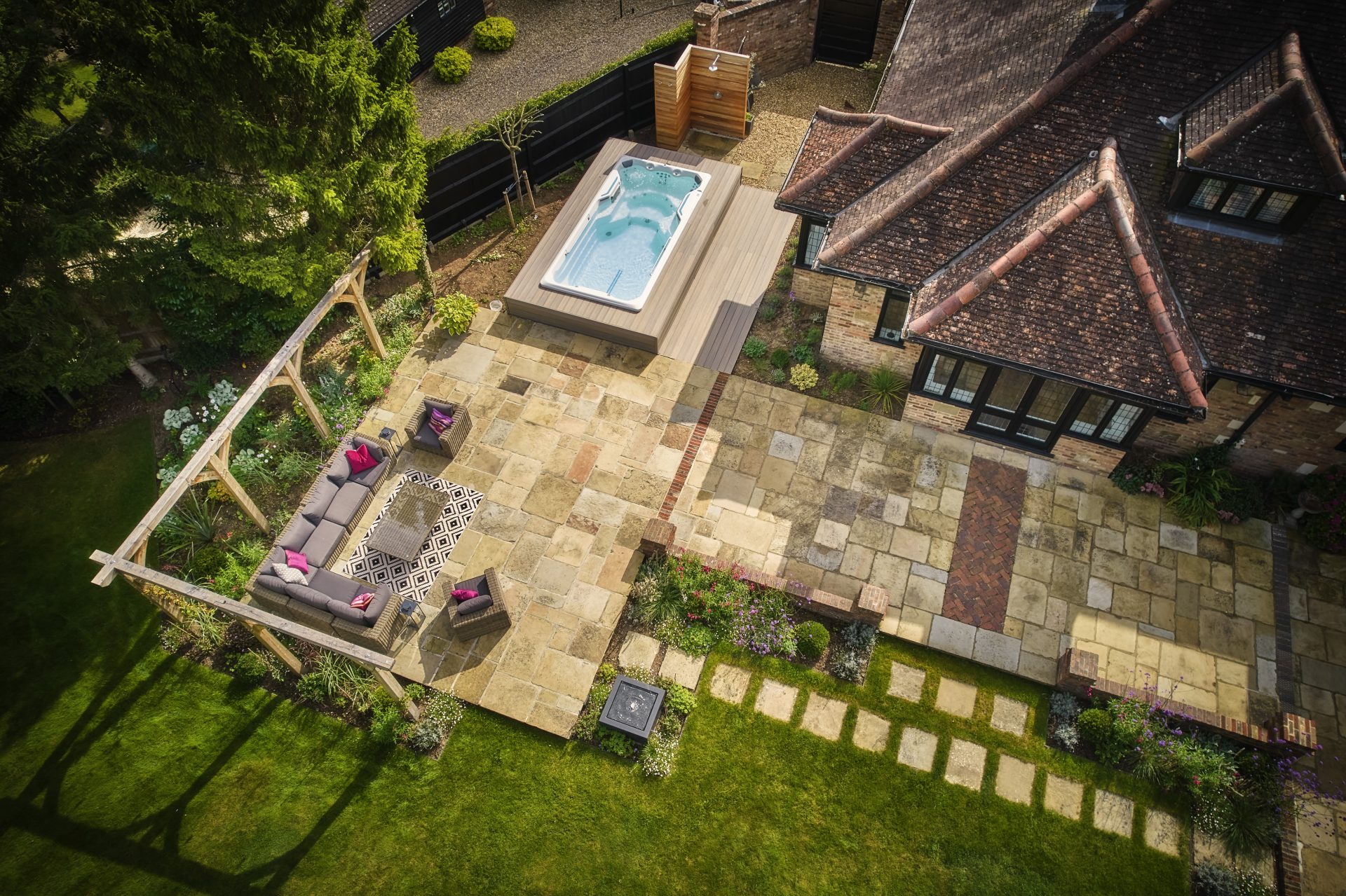 At the heart of this retreat lies a partially sunken swim spa, effortlessly woven into the landscape. Positioned for privacy yet open to tranquil views, it offers the perfect balance of seclusion and connection to nature. Nearby, a cedar-clad outdoor shower introduces a rustic touch of luxury and an invitation to unwind under the open sky in true countryside style.